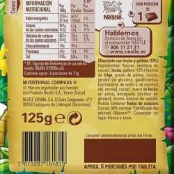Nestlé Jungly: El sabor clásico del chocolate con leche en 30 barritas individuales Disfruta de este snack de moda: deliciosas barritas de barquillo con chocolate con leche y trocitos de galleta. Este barquillo está cubierto por crema de cacao, aproximadamente un 47,3%. Contiene azúcar, manteca de cacao, pasta de cacao, leche desnatada en polvo, suero de leche, grasas lácteas y aceites vegetales. También incluye chocolate negro, emulgentes vegetales y gasificantes. Puede contener trazas de cacahuetes, frutos de cáscara y soja.